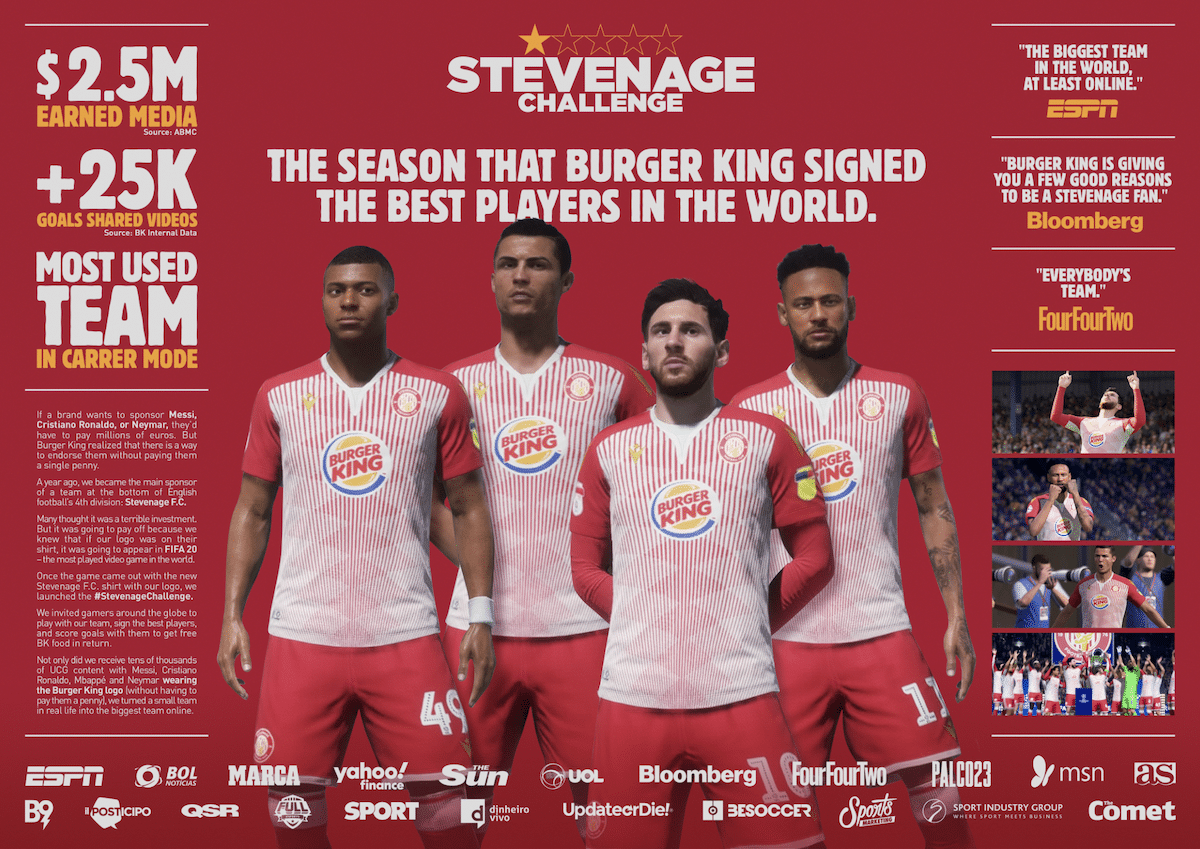 Vuonna 2018 Burger King alkoi sponsoroida englantilaista alasarjaseura FC Stevenagea. Kumppanuuden myötä burgerijätti sai ujutettua logonsa myös FIFA-peliin ja rakensi ympärille erittäin toimivan somekampanjan, jonka myötä seurasta tuli hitti niin virtuaalisesti kuin oikeassa elämässä, medianäkyvyyttä tehtailtiin miljoonien edestä ja seuran fanipaidat kävivät kuin kuumille kiville.
